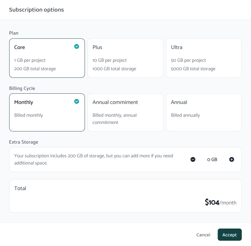Service Plan: Choose Core, Plus, or Ultra based on your project size and storage requirements (see the subscription table above for plan details).